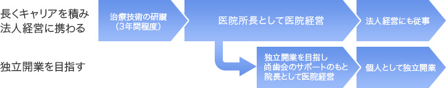 治療技術の研鑽を積んだ先には、各医院の所長を務めていただき、医院運営を主体的に担う立場としてキャリアを積んでいただきます。その後、経営に対する更なる知見を深めていただくべく、当法人全体の運営に携わる立場としてのポジションをご用意しています。