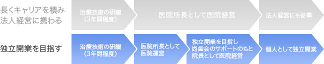 独立開業支援プログラムは、独立開業を志すドクターの皆さまがよりスムーズにステップアップできることを目的としたサポートの仕組みです。